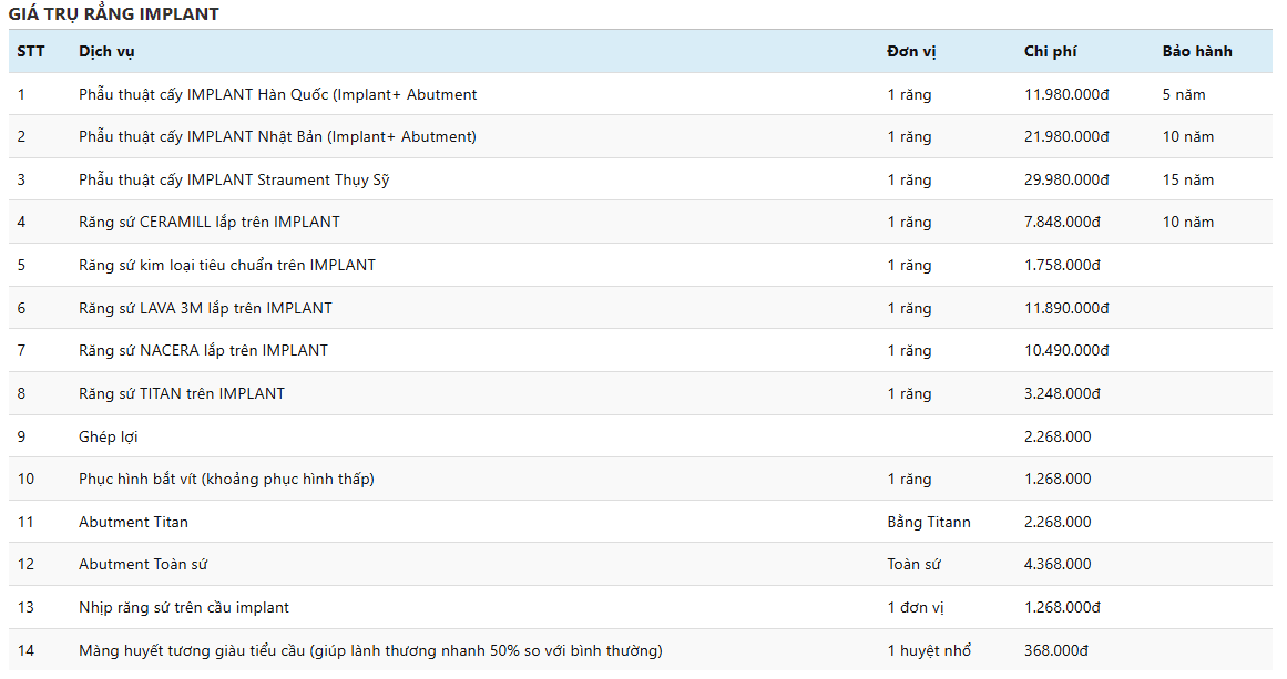 Giá trồng răng Implant phụ thuộc vào loại trụ, xuất xứ, và tình trạng xương hàm. Dưới đây là mức giá tham khảo năm 2025: