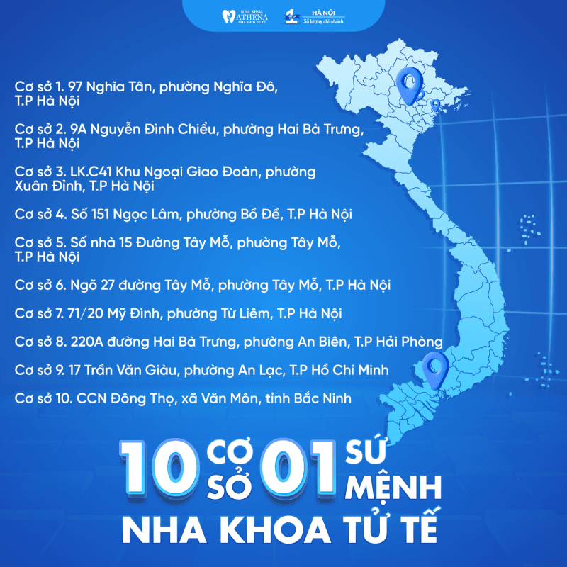 Tại Nha Khoa ATHENA, chúng tôi tự hào là đơn vị tiên phong với Top 1 chi nhánh tại Hà Nội và hơn 10 chi nhánh trên toàn quốc – khẳng định vị thế và uy tín với quy mô rộng khắp, mang đến sự tiện lợi tối đa cho kiều bào khi trở về.
